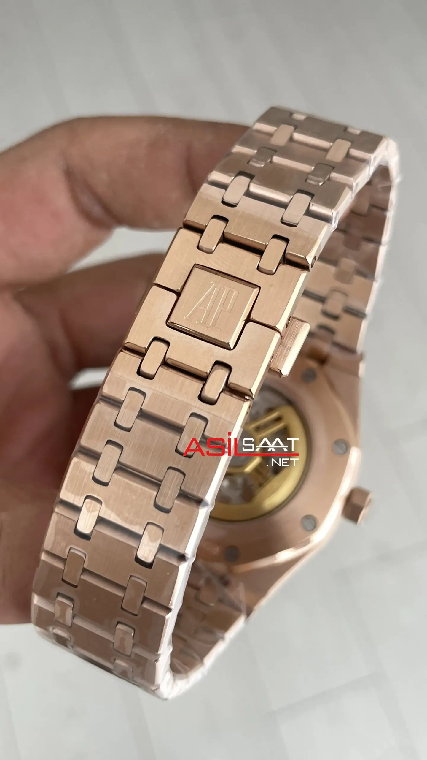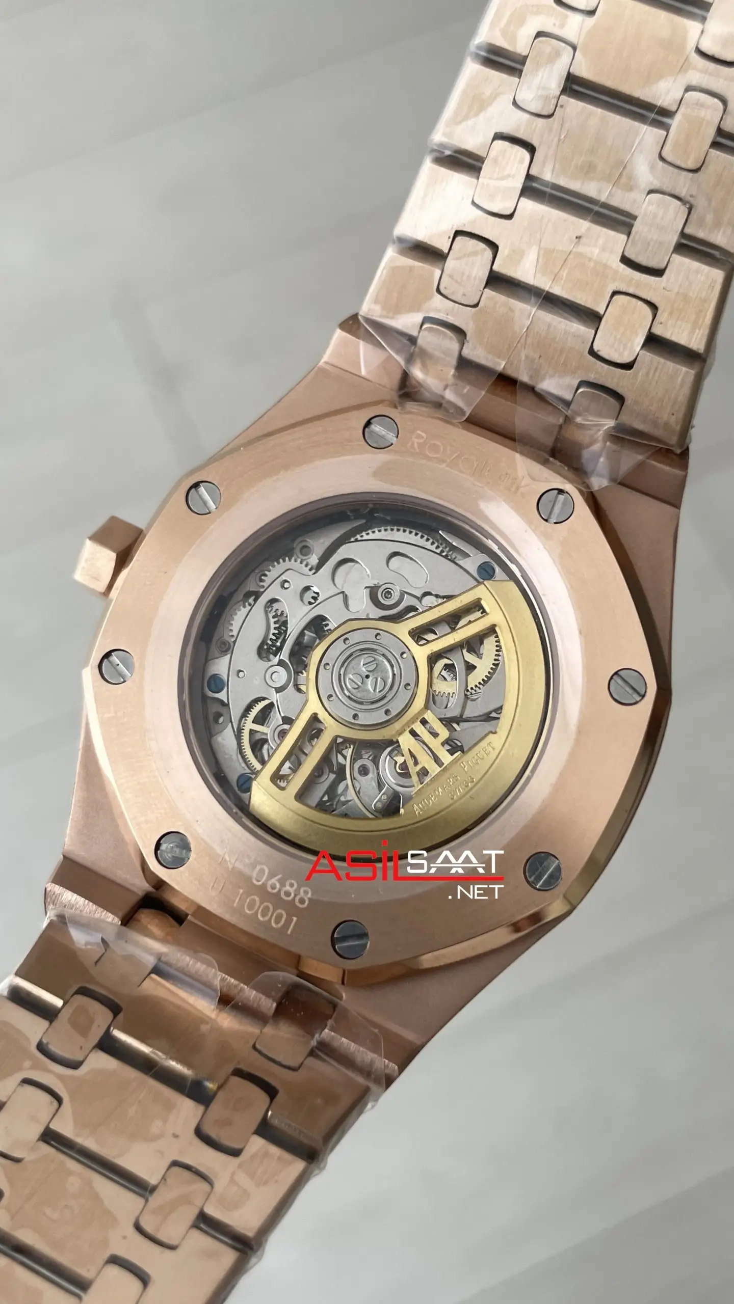 Audemars Piguet Royal Oak Skeleton 15407OR Double Balance iskelet Rose Replika Saat modelinin en büyük özelliklerinden biri ise; sekizgen bezeli ve vidalı tasarımı, ince bakla dilimli geniş kordon yapısı, iskelet kadranı ve transparan arka kapağı
