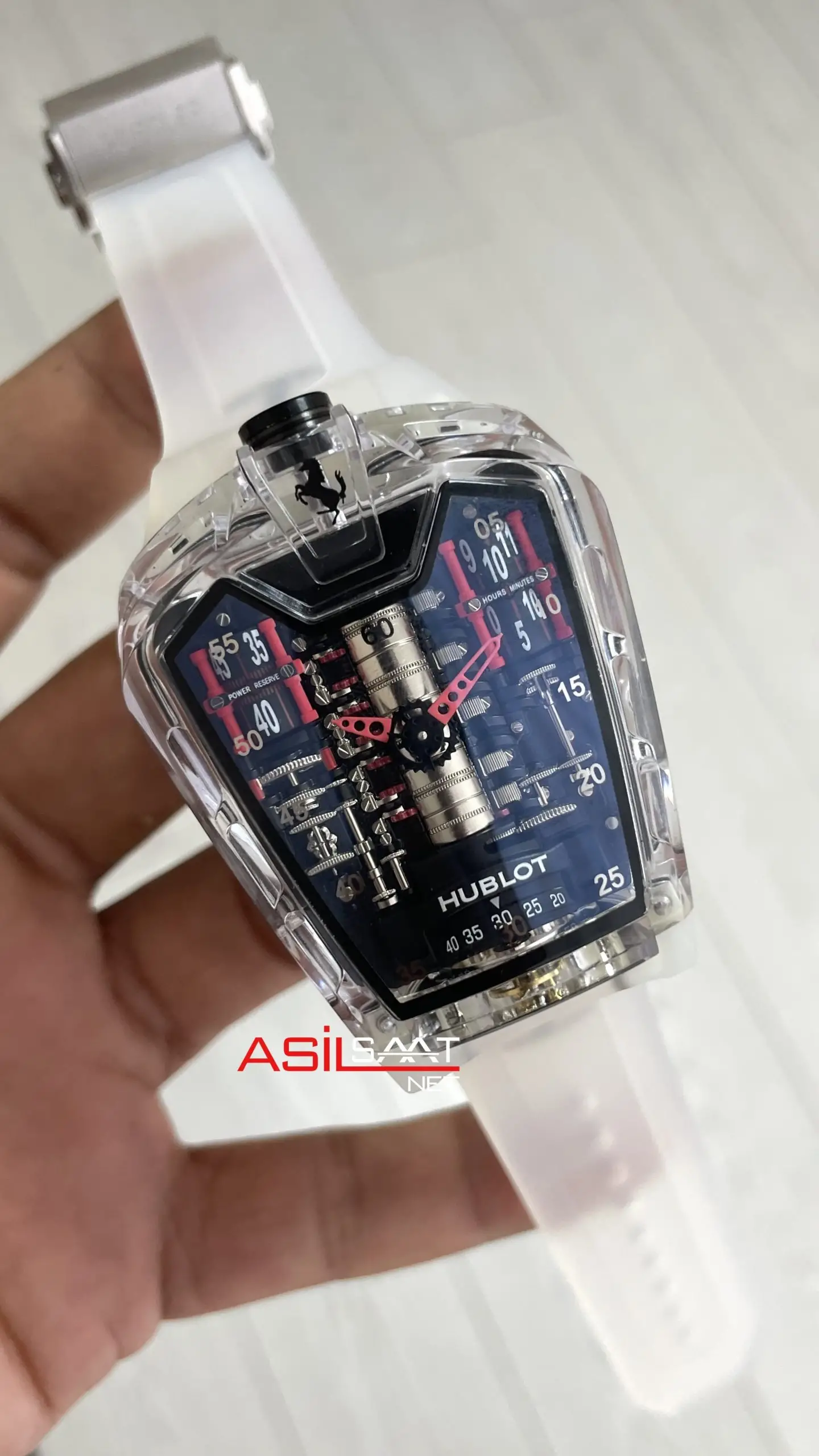 Hublot LaFerrari MP-05 Tourbillon Sapphire 46mm Şeffaf Replika Saat modeli, kendine has tarzıyla çizilmeyen safir kasası, kauçuk kayışı, çift katmanlı safir camı ve bombeli safir camı, çekmeli tepesi (kurma kolu), pilli mekanizması, katlanabilir tokası, 46mm kasa çapı ölçüsü ile en çok talep edilen modellerimizden biri olmayı başarmıştır. Bu saatin çizilmez safir kasası & çelik kasası ve kauçuk kayışıyla dayanıklılığı, sağlamlığı ve kullanım kolaylığını bir arada sağlayarak saatin kullanımını daha keyifli ve kolay hale getiriyor.