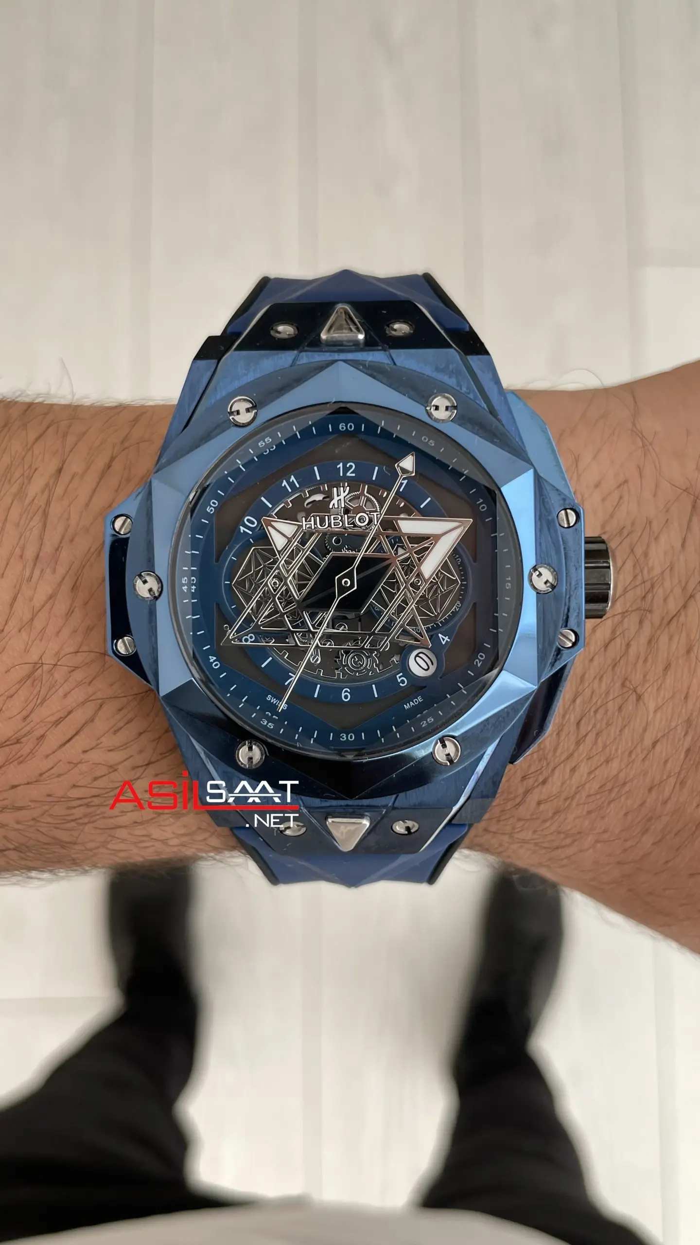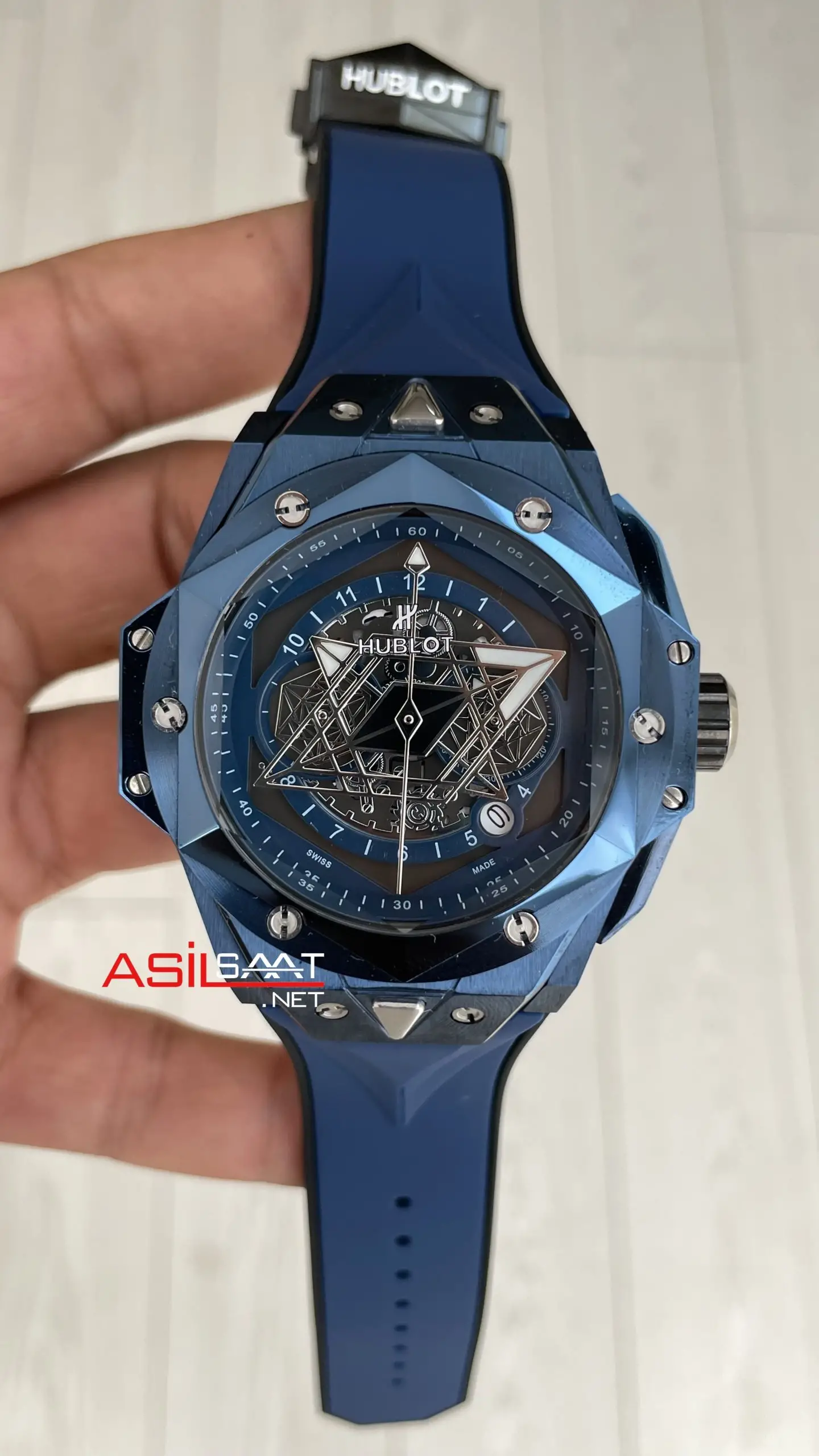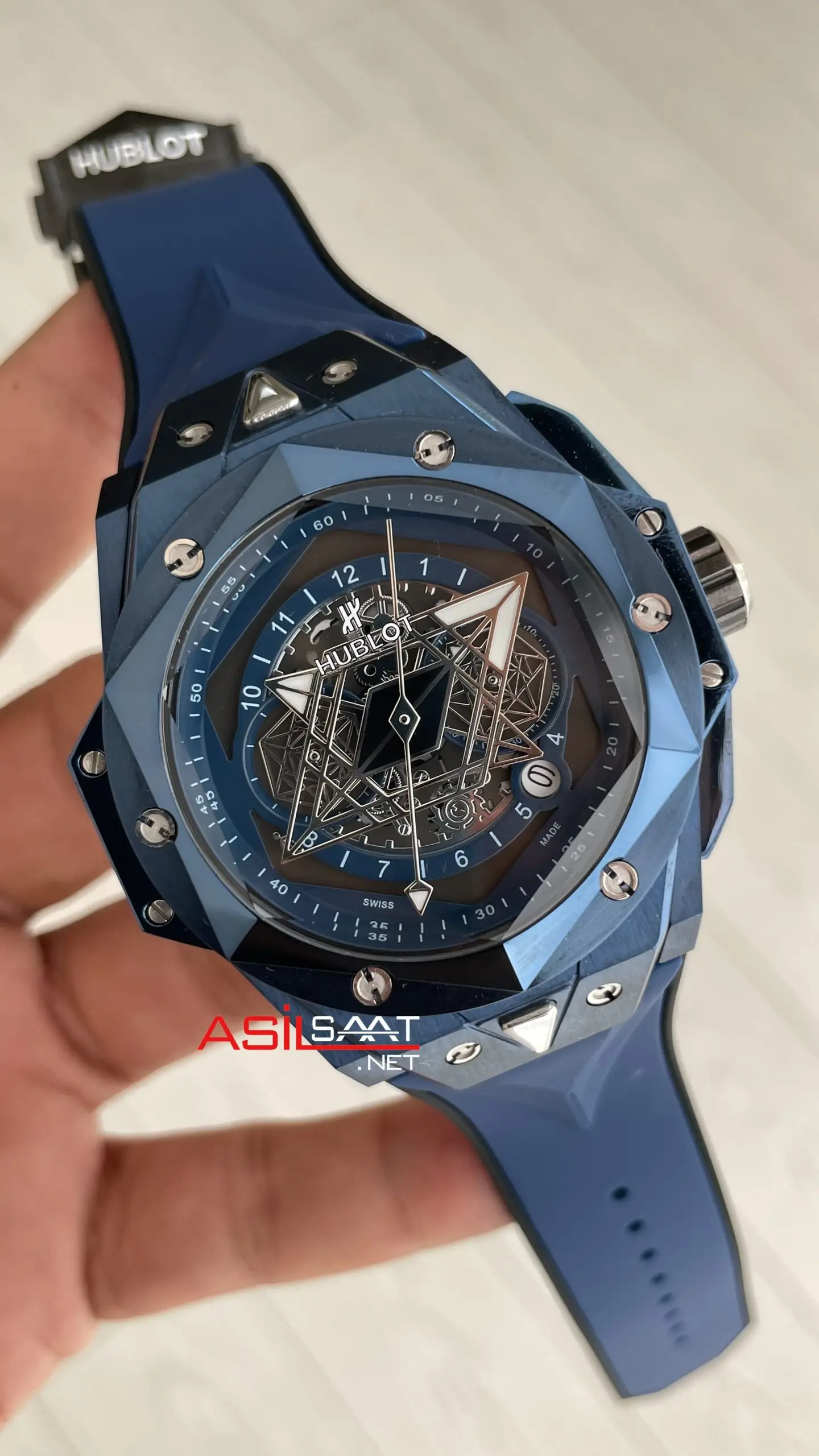 Hublot Sang Bleu II Blue 45mm Mavi Kadran Replika Saat modelinin en büyük özelliklerinden biri ise; dünyada ki en sofistik ve sansasyonel saat tasarımlarının üreticisi olmasıdır. Bu ünvanı yıllar geçse de tasarımı modernleşip isviçre saatçilikde zirvedeki yerini korumuştur. Kendisini diğer Hublot saat modellerinden ayıran en belirgin özellikleri ise; parlak çelik kasası, parlak çelik yedigen bezeli, arka kapağının açık olması ve iki kronometreli olması, akrep ve yelkovan yerine geometrik şekillerin döner halkalarla zaman göstermesi