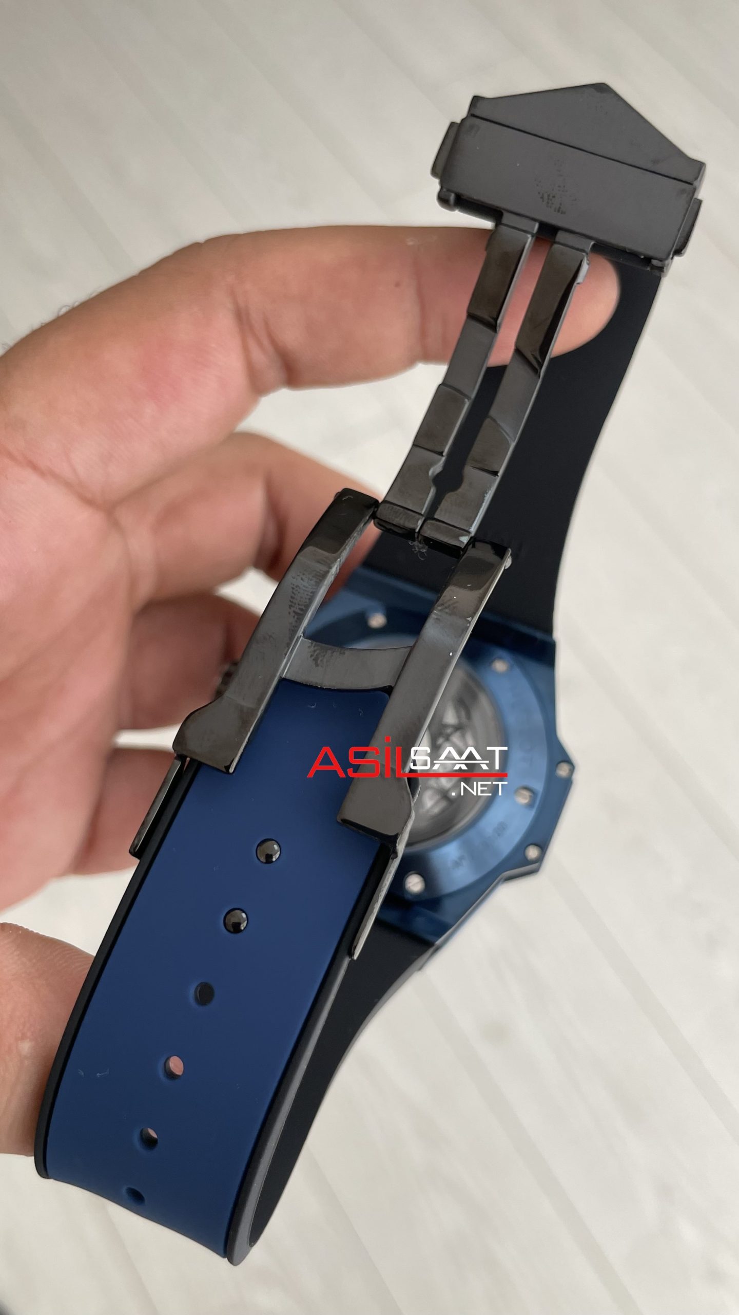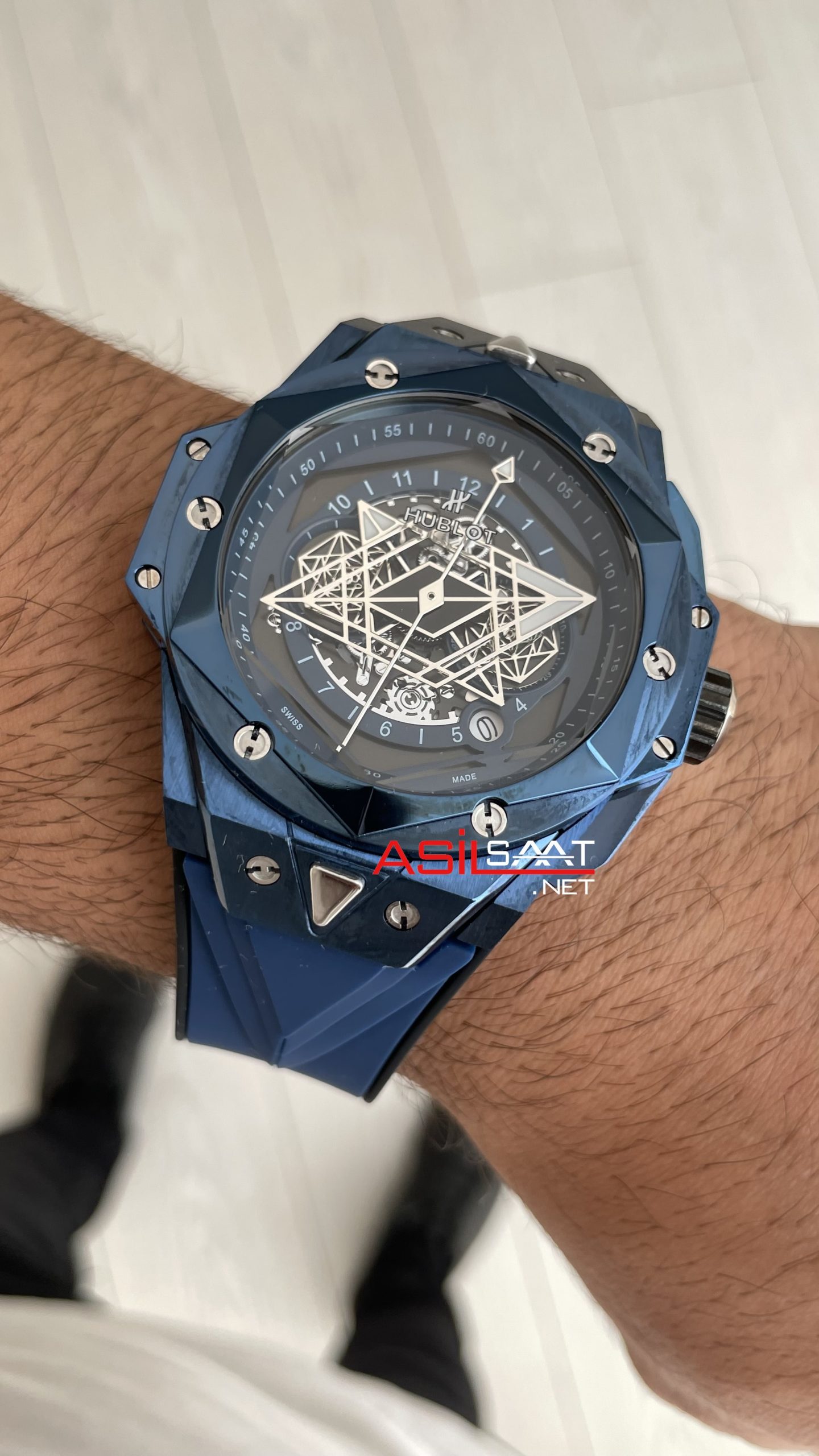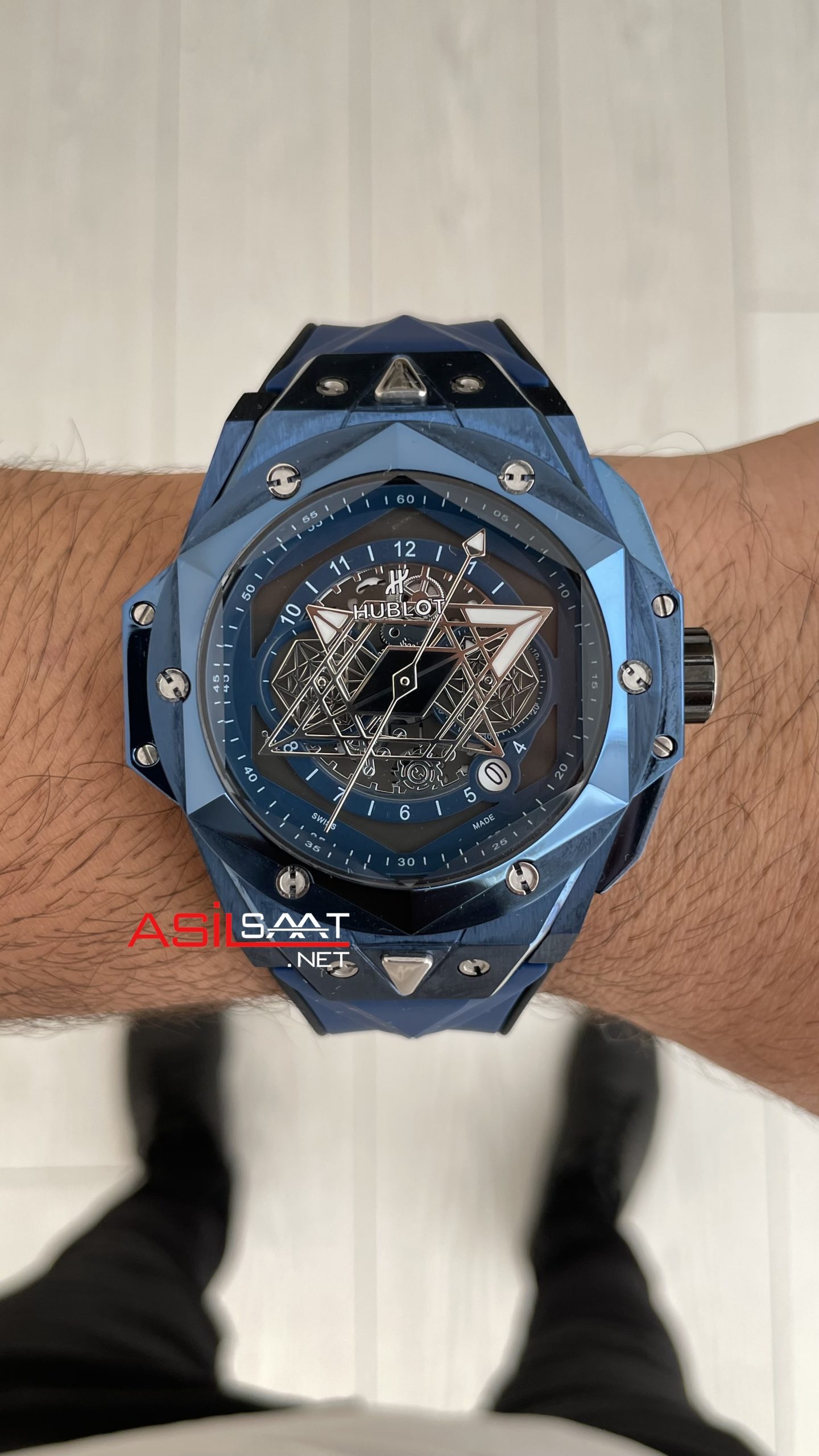 Hublot Sang Bleu II Blue 45mm Mavi Kadran Replika Saat modeli, kendine has tarzıyla parlak çelik kalın kasası yuvarlak kasası, parlak çelik bezeli, yumuşak kauçuk kayışı, çift katmanlı bombeli yedigen safir camı, çekmeli tepesi (kurma kolu), pilli vk64 mekanizması, katlanabilir yeni versiyon tokası, mikron ayrıntıları ve fosforlu indexleri ve 45mm kasa çapı ölçüsü ile en çok talep edilen modellerimizden biri olmayı başarmıştır. Bu saatin paslanmaz parlak çelik kasası ve kauçuk kayışıyla dayanıklılığı, sağlamlığı ve kullanım kolaylığını bir arada sağlayarak saatin kullanımını daha keyifli ve kolay hale getiriyor.
