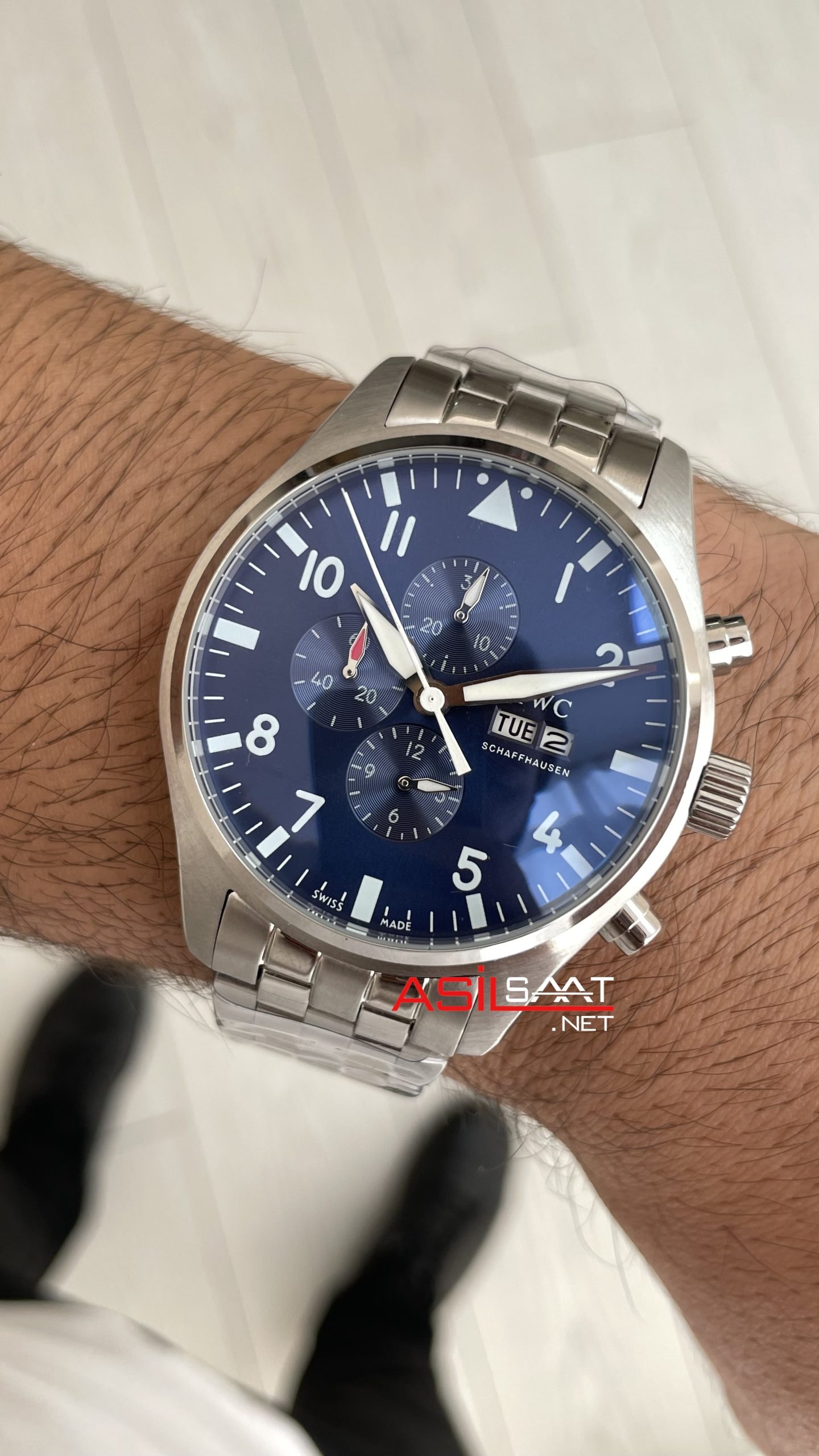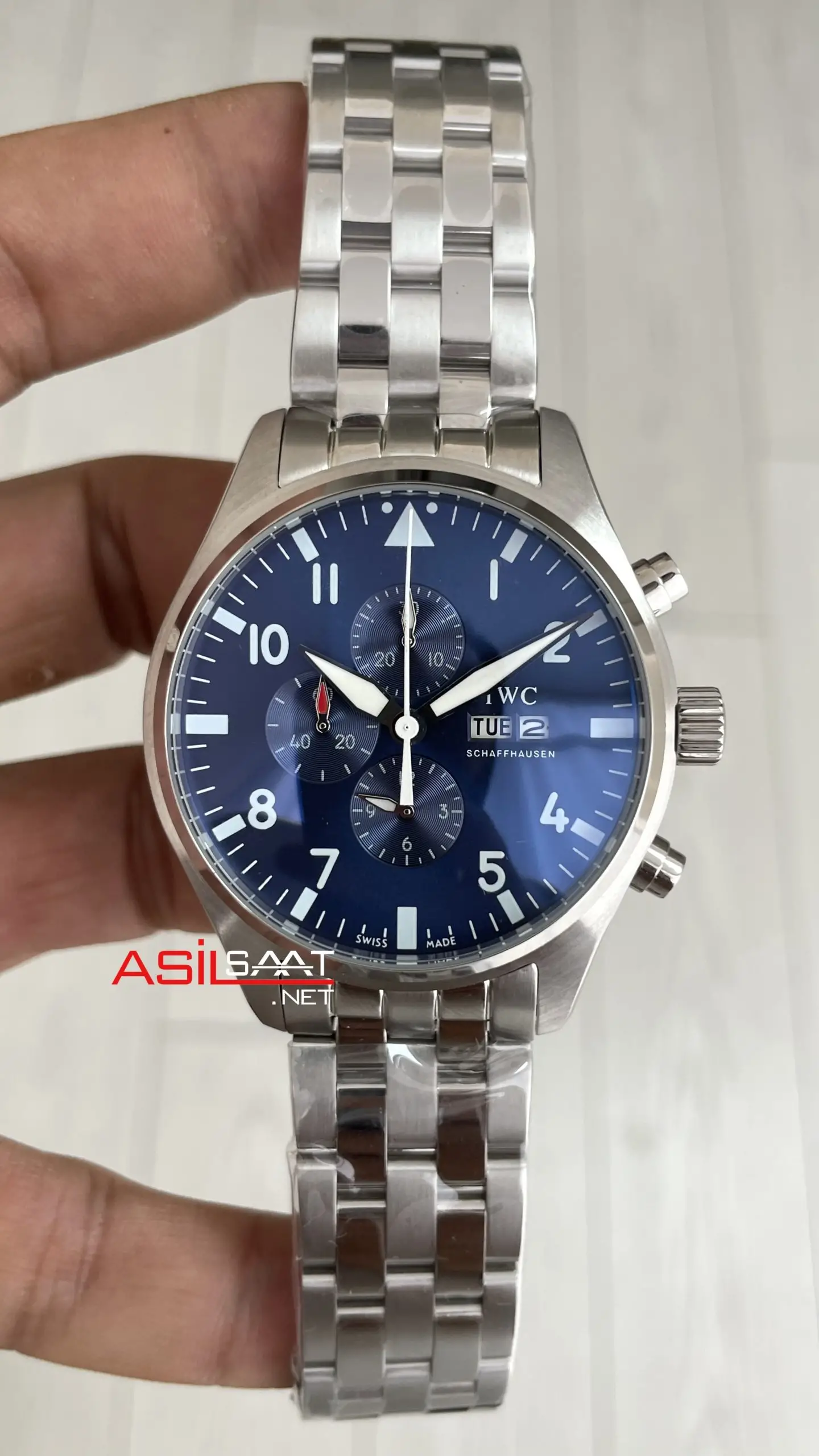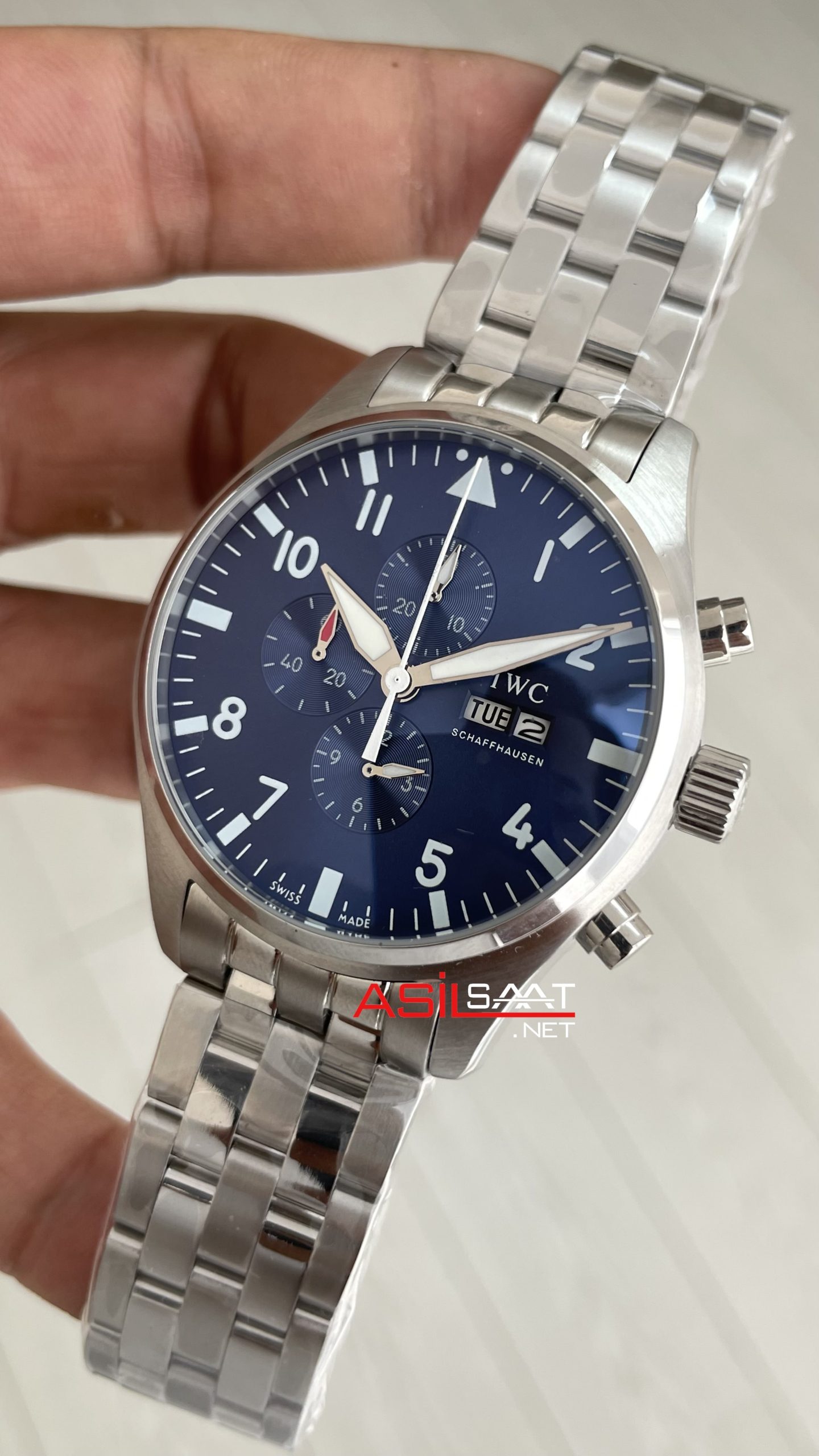 IWC Pilot Chronograph Blue IW378004 Mavi Kadran 43mm Replika Saat modeli, kendine has tarzıyla slim yuvarlak ve parlak çelik kasası, ince dilimli parlak çelik bileziği, çift katmanlı bombeli safir camı, çekmeli tepesi (kurma kolu), basmalı butonları, pilli mekanizması, gün ve tarih göstergesi, katlanabilir tokası, mikron kadranı ve fosforlu indexleri ve 43mm kasa çapı ölçüsü ile en çok talep edilen modellerimizden biri olmayı başarmıştır. Bu saatin paslanmaz çelik kasası ve paslanmaz çelik bileziğiyle dayanıklılığı, sağlamlığı ve kullanım kolaylığını bir arada sağlayarak saatin kullanımını daha kolay ve keyifli hale getiriyor.