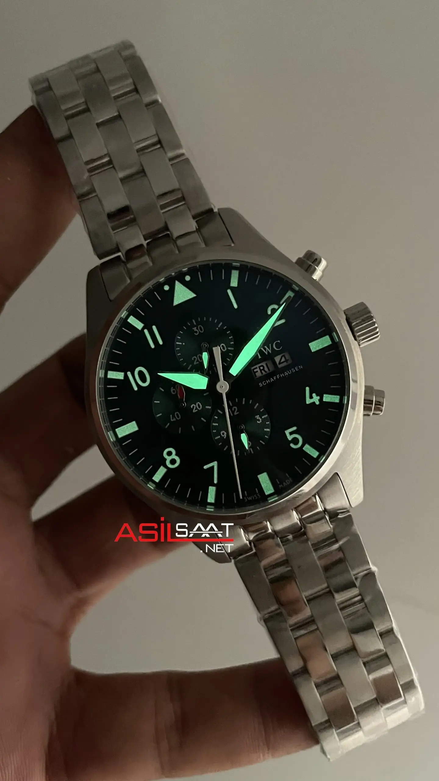IWC Pilot Chronograph Green IW388104 Yeşil Kadran 43mm Replika Saat modeli, kendine has tarzıyla slim yuvarlak ve parlak çelik kasası, ince dilimli parlak çelik bileziği, çift katmanlı bombeli safir camı, çekmeli tepesi (kurma kolu), basmalı butonları, pilli mekanizması, tarih ve gün göstergesi, katlanabilir tokası, mikron kadranı ve fosforlu indexleri ve 43mm kasa çapı ölçüsü ile en çok talep edilen modellerimizden biri olmayı başarmıştır. Bu saatin paslanmaz çelik kasası ve paslanmaz çelik bileziğiyle dayanıklılığı, sağlamlığı ve kullanım kolaylığını bir arada sağlayarak saatin kullanımını daha kolay ve keyifli hale getiriyor.
