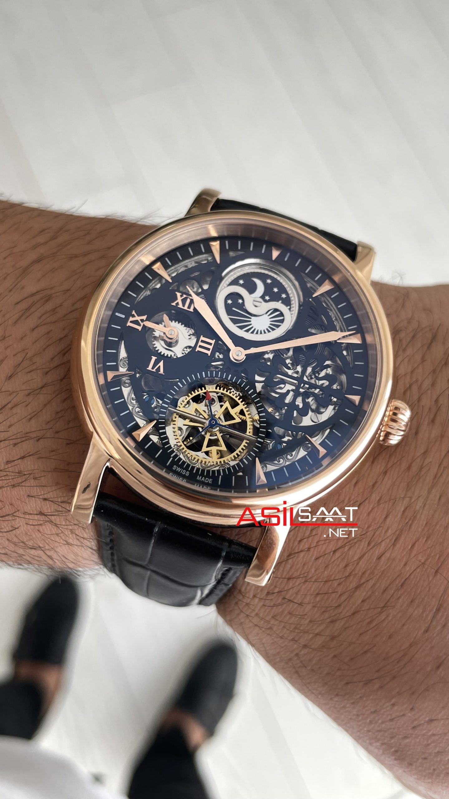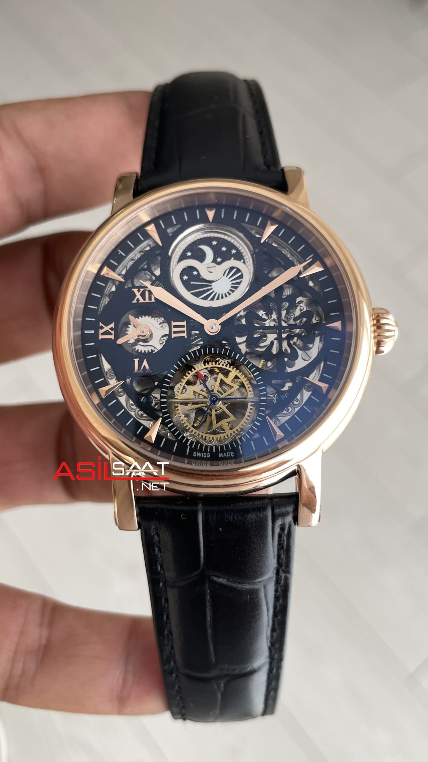 Patek Philippe Geneve Tourbillon Moonphase Skeleton Siyah Kadran 42 mm İskelet Rose Replika Saat modelinin en dikkat çeken özelliklerinden biri ise; kadran üzerinde yer alan ay fazı (mehtap) göstergesi. 24 Saat zaman dilimli ayarlanabilen gece ve gündüz göstergelidir. Ayın evrelerini gerçek zamanlı olarak takip edebileceğiniz bu komplikasyon, saate hem romantik hem de astronomik bir görüntü kazandırıyor.
