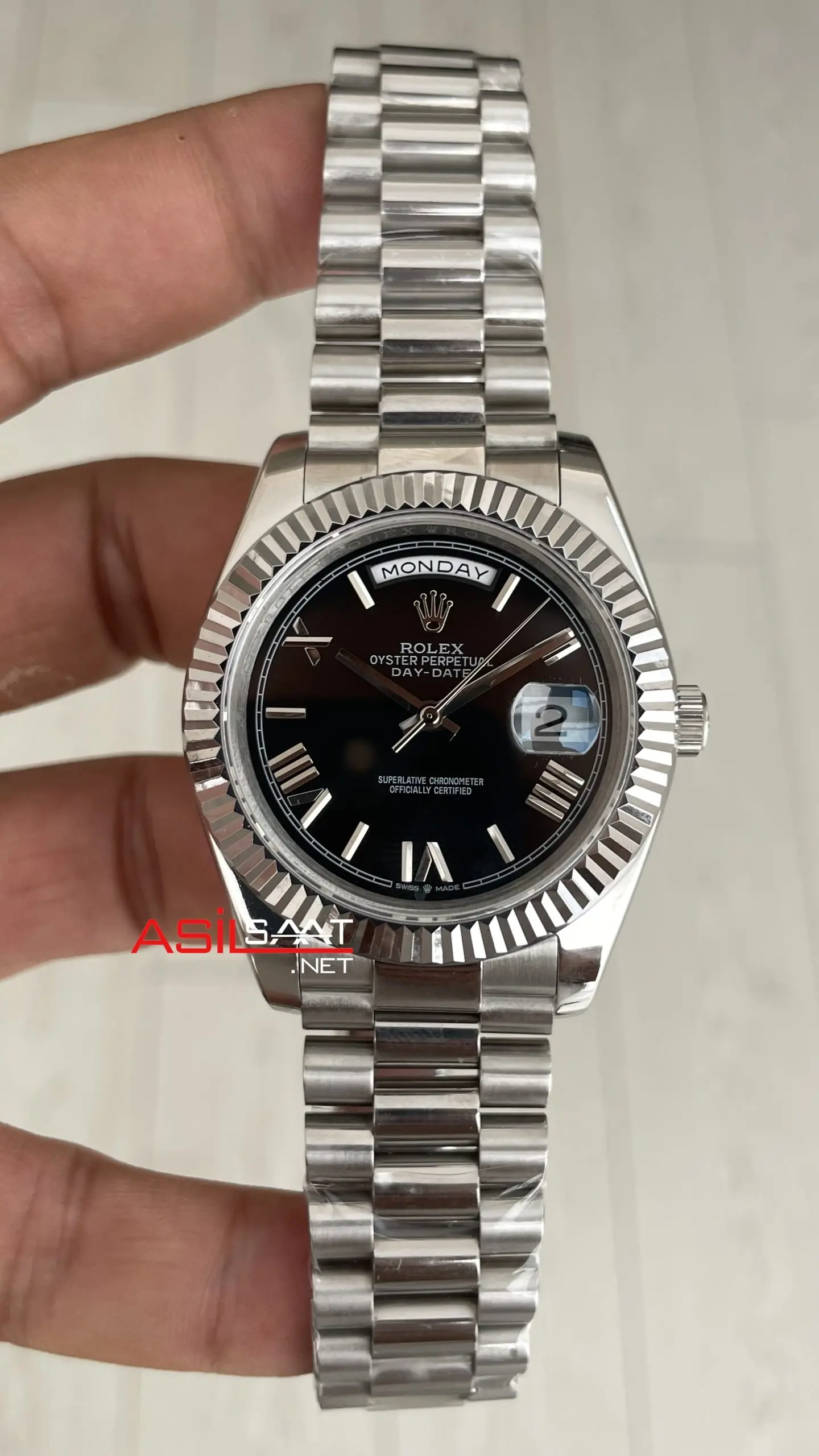 Rolex Day Date Siyah Kadran 228239 Black Roman Dial 40mm Replika Saat modeli, kendine has tarzıyla slim yuvarlak ve parlak çelik kasası, ince dilimli parlak çelik president bileziği, çelik fluted ya da smooth bezeli, çift katmanlı büyüteçli safir camı, vidalı tepesi (kurma kolu), gün ve tarih gösteren kadranı, otomatik mekanizması, 40mm kasa çapı ölçüsü ile en çok talep edilen modellerimizden biri olmayı başarmıştır. Bu saatin paslanmaz çelik kasası ve paslanmaz çelik bileziğiyle dayanıklılığı, sağlamlığı ve kullanım kolaylığını bir arada sağlayarak saatin kullanımını daha keyifli ve kolay hale getiriyor.