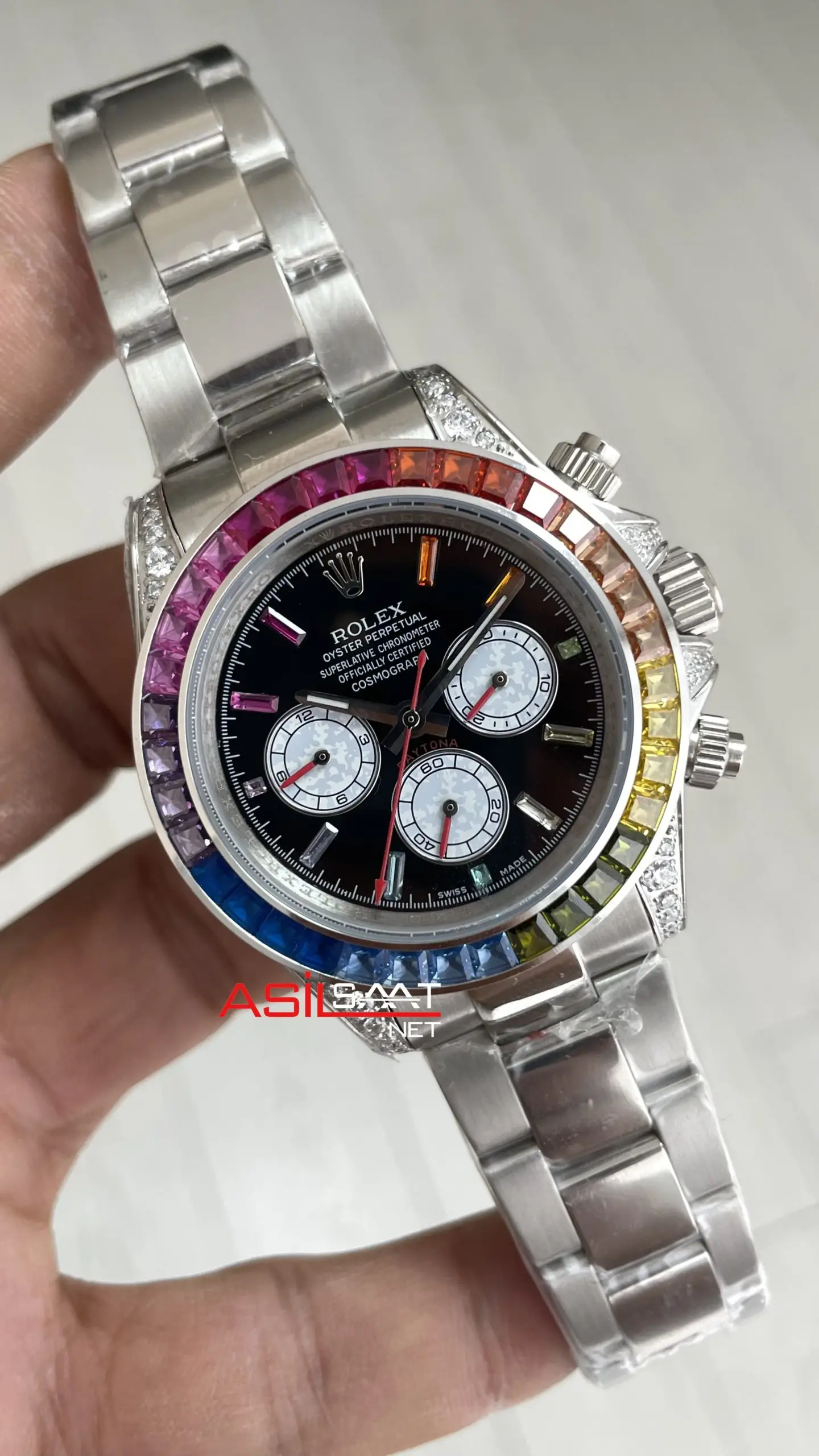 Rolex Daytona Rainbow 126599RBOW Replika Saat modeli, kendine has tarzıyla slim yuvarlak parlak mat çelik kasası, ince dilimli parlak mat çelik oyster bileziği, baget taşlı bezeli, çift katmanlı safir camı, üç noktalı vidalı tepesi (kurma kolu) ve vidalı butonları, otomatik mekanizması, ek uzatmalı ve katlanabilir tokası, mikron ayrıntılı kadranı, fosforlu indexleri ve 40mm kasa çapı ölçüsü ile en çok talep edilen modellerimizden biri olmayı başarmıştır. Bu saatin paslanmaz mat parlak çelik kasası ve paslanmaz mat parlak çelik bileziğiyle dayanıklılığı, sağlamlığı ve kullanım kolaylığını bir arada sağlayarak saatin kullanımını daha kolay ve keyifli hale getiriyor.