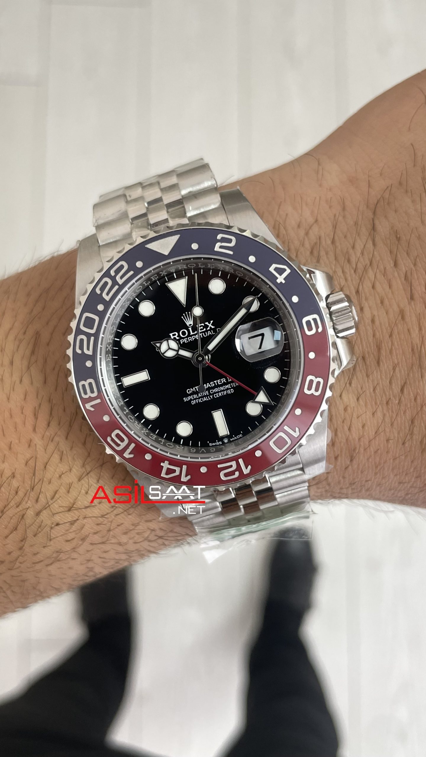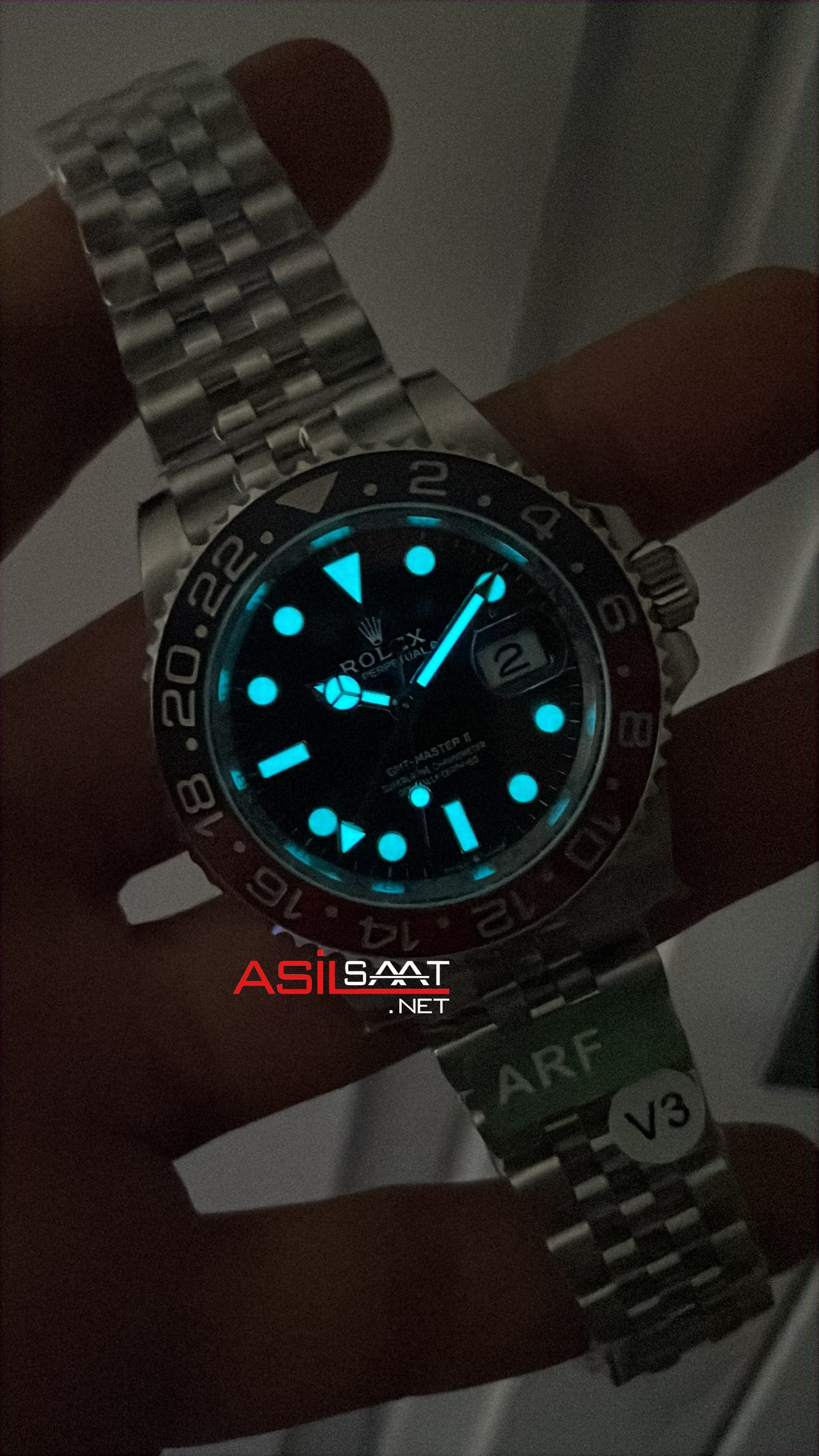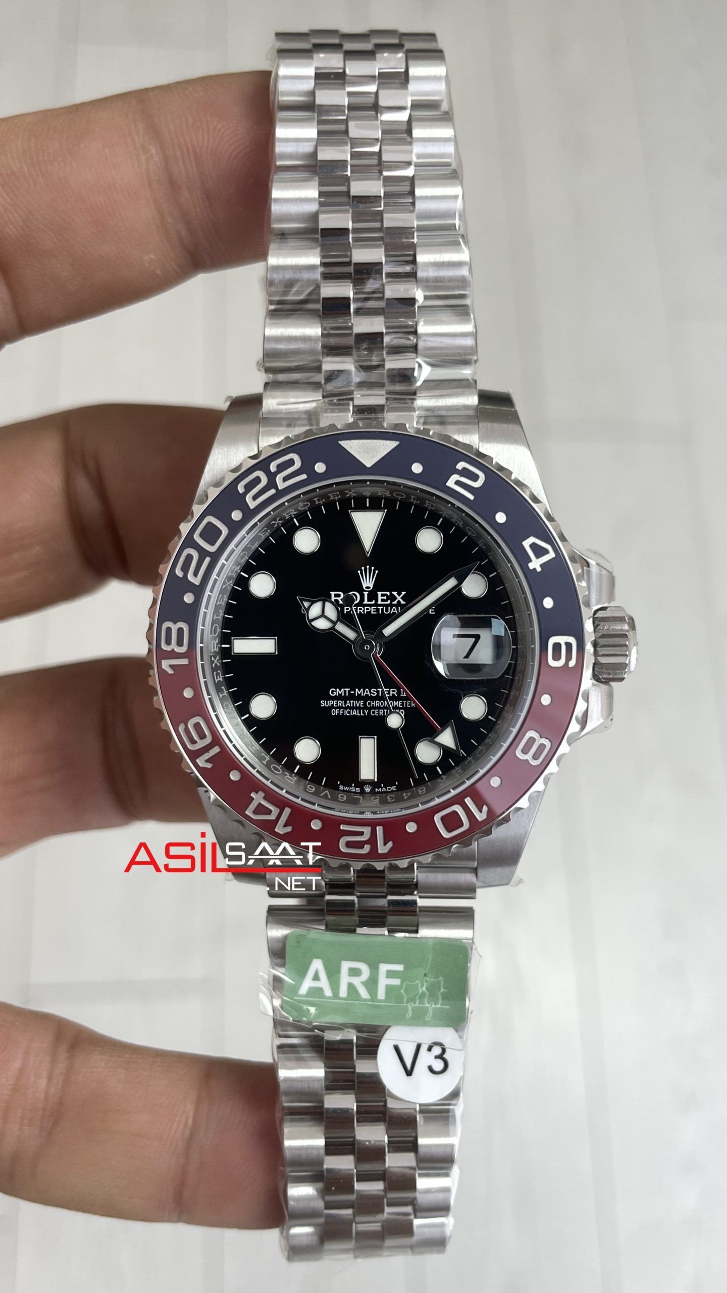 Rolex Pepsi Gmt Master II 126710BLRO Jubilee 40mm 3285 AR Factory V3 Super Klon Eta Swiss modeli, kendine has tarzıyla slim yuvarlak ve parlak çelik kasası, ince dilimli parlak çelik jubilee bileziği, çift tarafa döndürülebilen çift renkli çelik çerçeveli cerachrom seramik bezeli, çift katmanlı cyclops büyüteçli safir camı, üç noktalı vidalı tepesi (kurma kolu), 70 saat rezervli otomatik mekanizması, ek uzatmalı ve katlanabilir klipsi,siyah kadranı ve fosforlu indexleri ve 40mm kasa çapı ölçüsü ile en çok talep edilen modellerimizden biri olmayı başarmıştır. Bu saatin paslanmaz çelik kasası ve paslanmaz çelik bileziğiyle dayanıklılığı, sağlamlığı ve kullanım kolaylığını bir arada sağlayarak saatin kullanımını daha keyifli ve kolay hale getiriyor.
