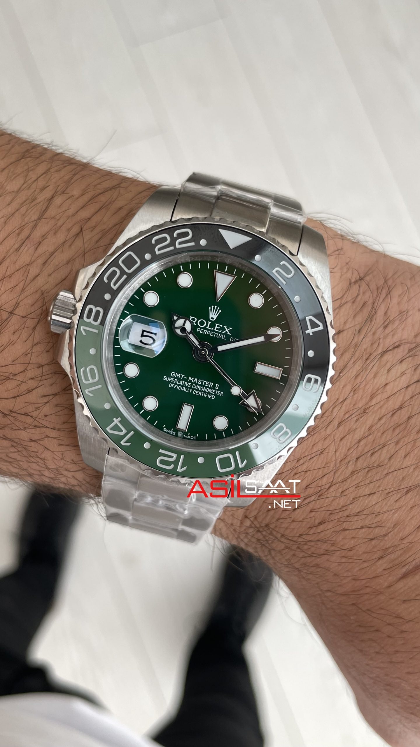 Rolex Sprite Gmt Master II 126729VTNR Oyster 40mm Replika Saat modeli, safir cam kullanılarak dayanıklılığını ve sağlamlığını tamamlayan bir özelliktir. Bu çift katmanlı safir cam, çizilmelere ve darbelere karşı dirençlidir ve saatimizin uzun yıllar boyunca berraklığını ve parlaklığının korunmasını sağlar. Dışarıya doğru çıkıntısı olan çift katmanlı safir camı ve okunurluğu güzel olan kalın ve geniş merceği, anlaşılabilir takvim özelliği ile kusursuzdur ve Cyclops bütüyeç lensi tarih penceresi kolayca okumanızı sağlar ve 6 rakamının hizasında ki camın üstünde rolex holigramı mevcuttur. Her bakışta saatini görmekten keyif alacak ve göz alıcı şıklığınızla dikkatleri üzerinize çeker. Çift tarafa döndürülebilen yeni varyasyonlu cerachrom seramik bezeli zaman göz alıcı şekilde parlaklıktadır.