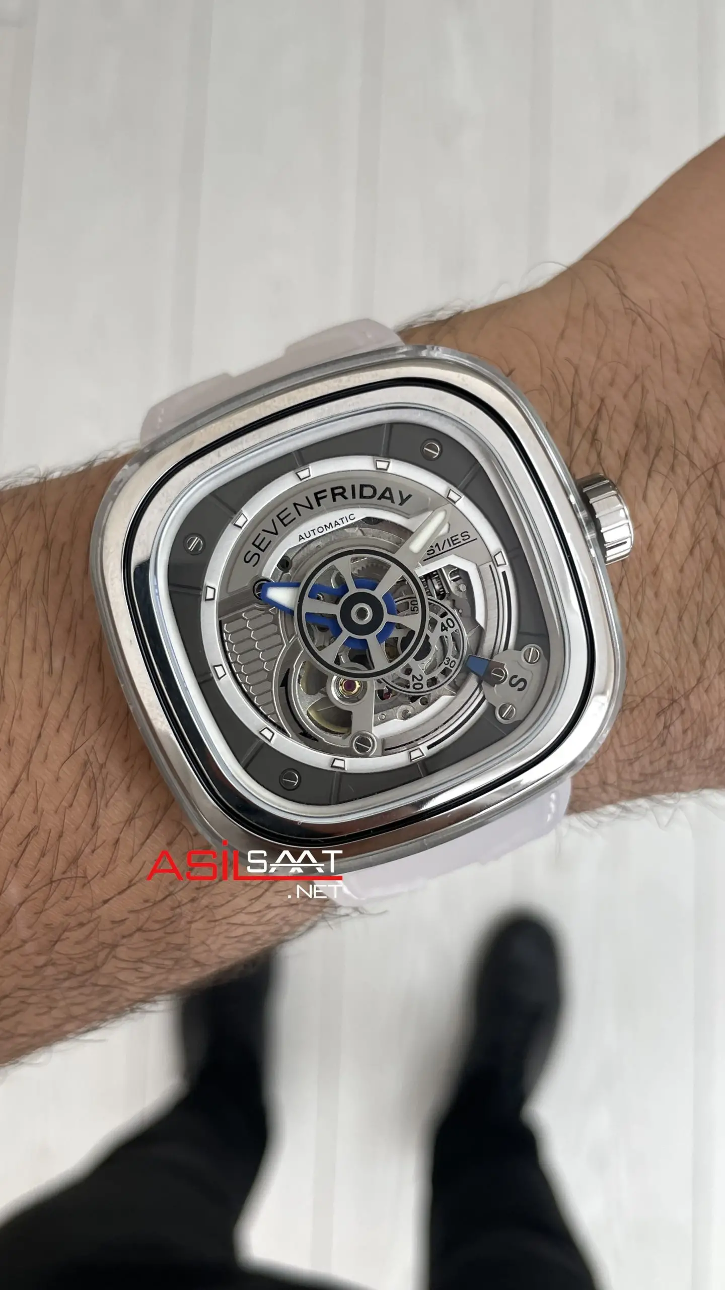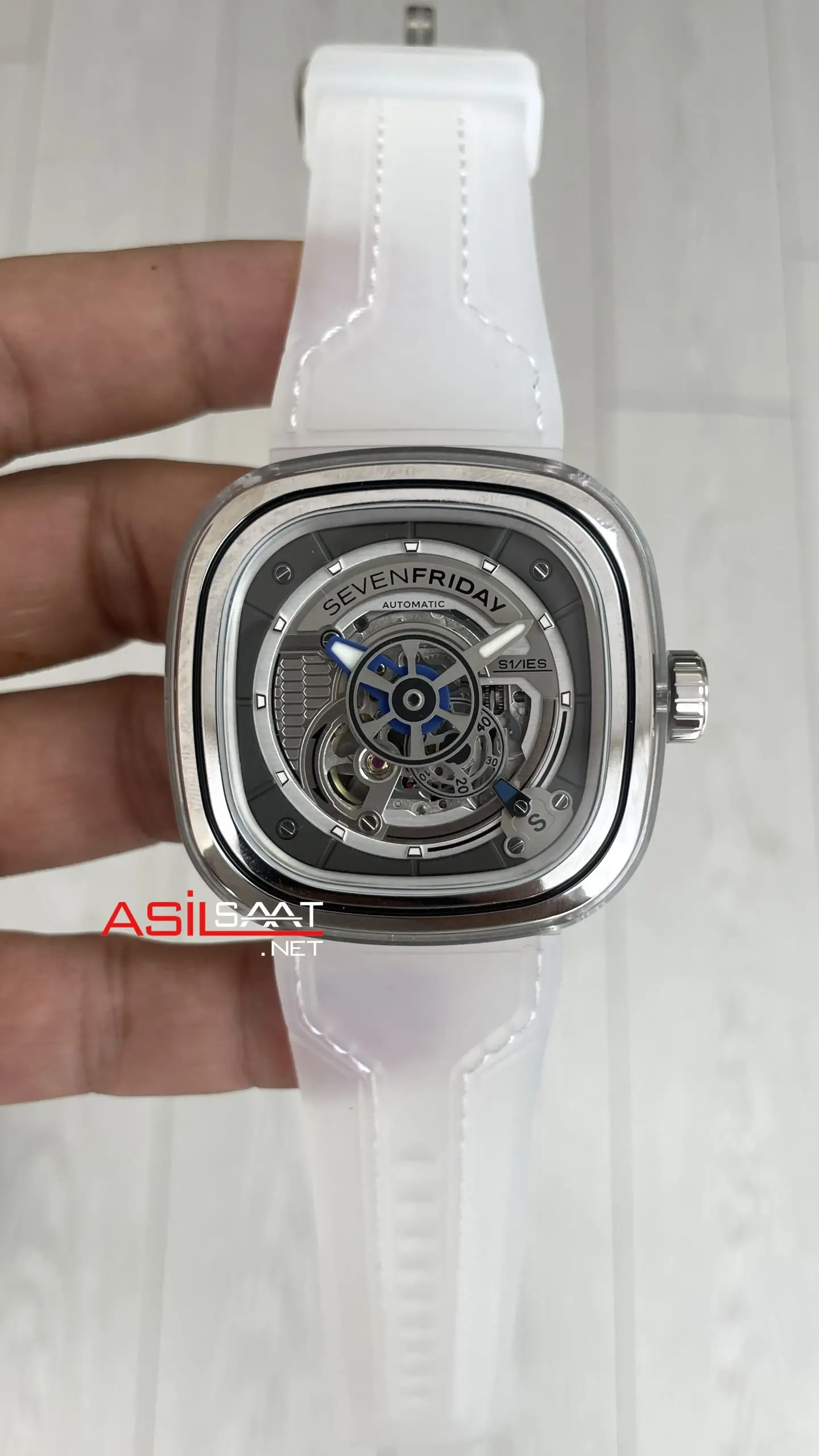 SevenFriday S Serisi SF-S1/01 Recyclable Nylon Şeffaf Silver 47mm Replika Saat modeli, kendine has tarzıyla kare şeffaf ve çelik parlak çelik kasası, şeffaf kauçuk kordonu, çift katmanlı hafif bombeli safir camı, tepesi (kurma kolu), otomatik mekanizması, katlanabilir klipsi, mikron detaylı kadranı ve tourbillonlu kompakt fonsiyonu, fosforlu indexleri ve 40mm kasa çapı ölçüsü ile en çok talep edilen modellerimizden biri olmayı başarmıştır. Bu saatin paslanmaz çelik kasası ve paslanmaz çelik kordonuyla dayanıklılığı, sağlamlığı ve kullanım kolaylığını bir arada sağlayarak saatin kullanımını daha keyifli ve kolay hale getiriyor.