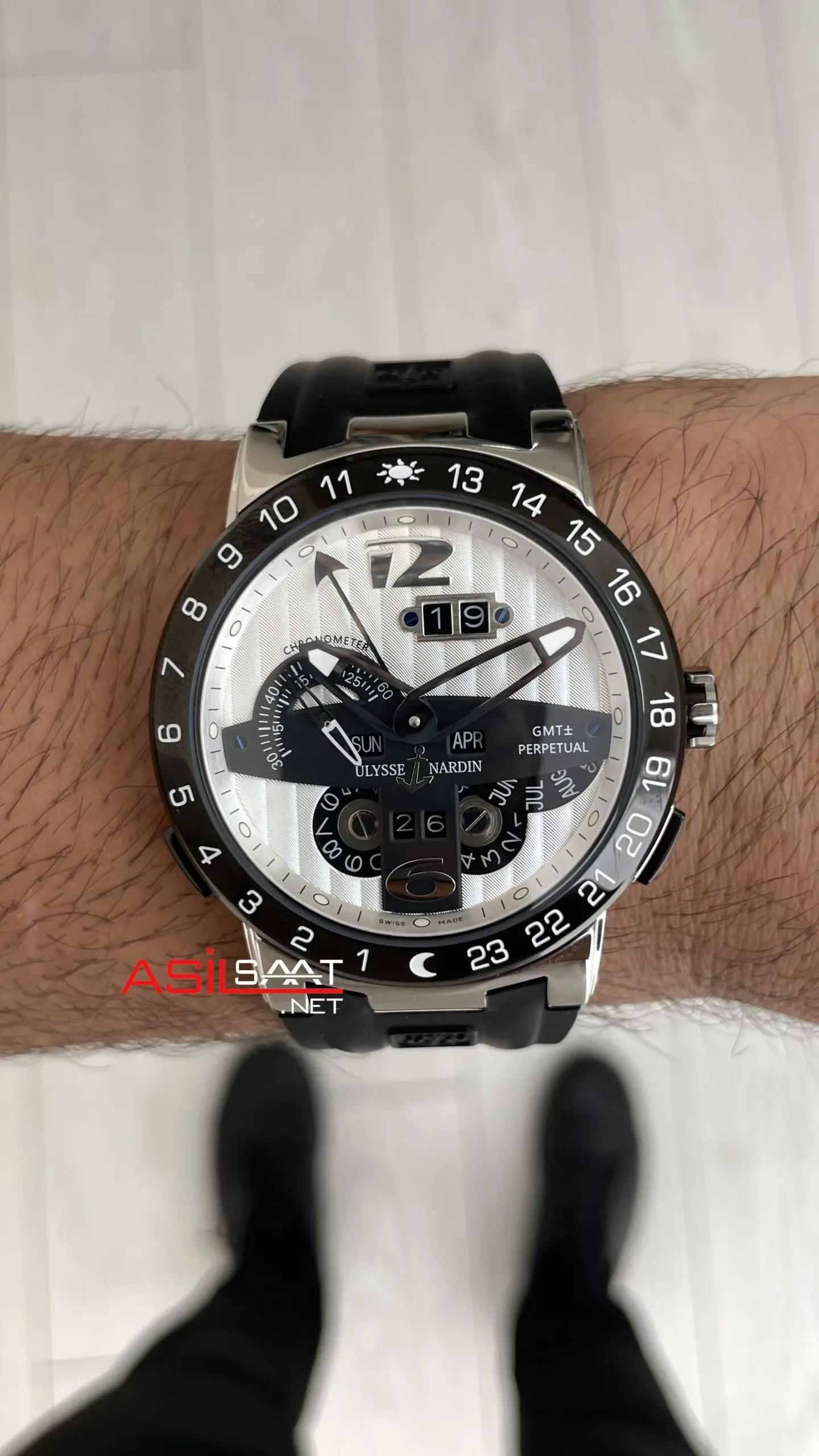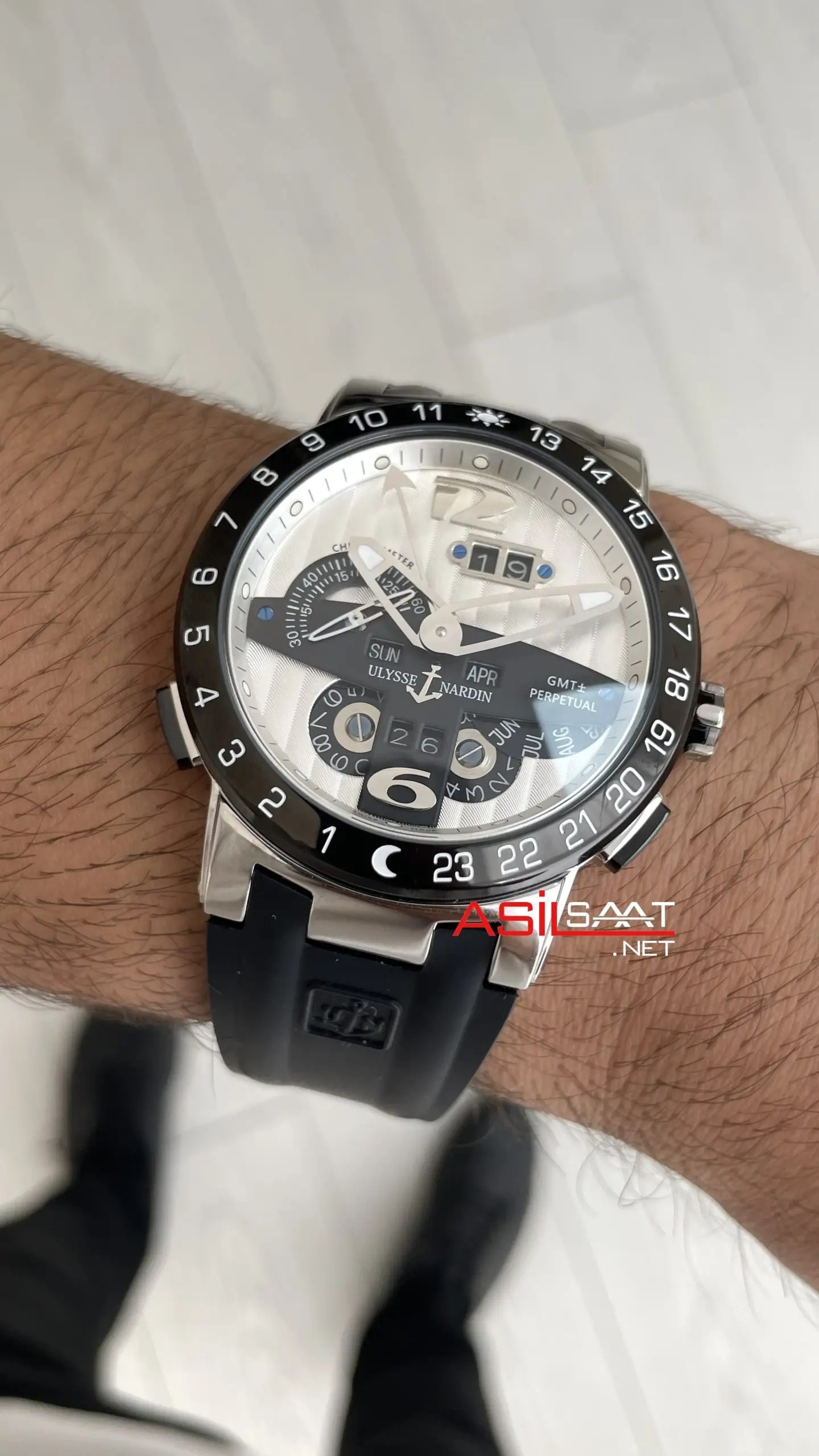 Ulysse Nardin El Toro GMT Perpetual Executive Beyaz Kadran 43mm Replika Saat modelinin kadran tasarımında ki, yelkenden esinlenerek kalın çizgili tasarımı, kar tanesi şeklindeki indexleri, akrep ile yelkovanının berraklığını ve 4. GMT ibresi markanın imza niteliğinde olmasıdır. Beyaz ve siyah kadran rengi güvenilir ve dürüst bir görünüm sunmayı seven erkekler için ideal bir seçenek ve her anınıza ayrıcalık katacaktır. GMT ibresi 24 saatlik ölçekli bezel ile birlikte çalışarak aynı anda farklı bir saat dilimini takip etmenizi sağlar. Normal akrep 12 saatte bir tur atarken GMT ibresi 24 saatte bir tur tamamlar. Bu sayede gündüz ile geceyi kolayca ayırt edebilirsiniz.