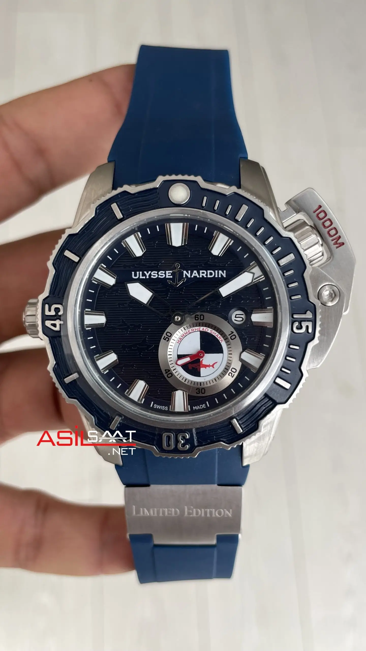 Ulysse Nardin Hammerhead Shark Diver Deep Dive Mavi Kadran 46mm Silver Blue Replika Saat modeli, kendine has tarzıyla yuvarlak ve parlak çelik kasası, kauçuk kordonu, parlak geniş yivli çelik bezeli, çift katmanlı safir camı, vidalı tepesi (kurma kolu), otomatik mekanizması, saniye kronometreli kadranı ve yüksek luminorlu fosforlu indexleri ve 46mm kasa çapı ölçüsü ile en çok talep edilen modellerimizden biri olmayı başarmıştır. Bu saatin paslanmaz çelik kasası ve kauçuk kordonuyla dayanıklılığı, sağlamlığı ve kullanım kolaylığını bir arada sağlayarak saatin kullanımını daha keyifli ve kolay hale getiriyor.